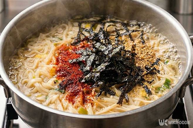 10분 타이머가 울리면 불을 끄고 그릇에 담는다. 그릇에 담은 뒤 참기름 두세 방울을 먼저 떨어뜨리고, 김가루 1.5큰술, 깨소금 1.5큰술, 고춧가루 1큰술 순서로 올린다. 바로 섞지 말고 잠깐 기다렸다가 고춧가루가 국물에 어느 정도 퍼지면 섞어서 먹는다. 그래야 고춧가루가 날리지 않고 국물에 잘 스며든다. 신김치와 함께 먹으면 궁합이 잘 맞는다.