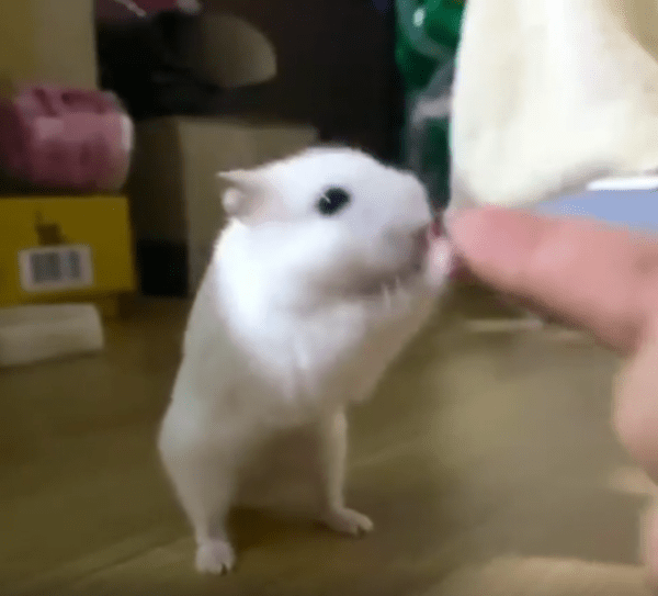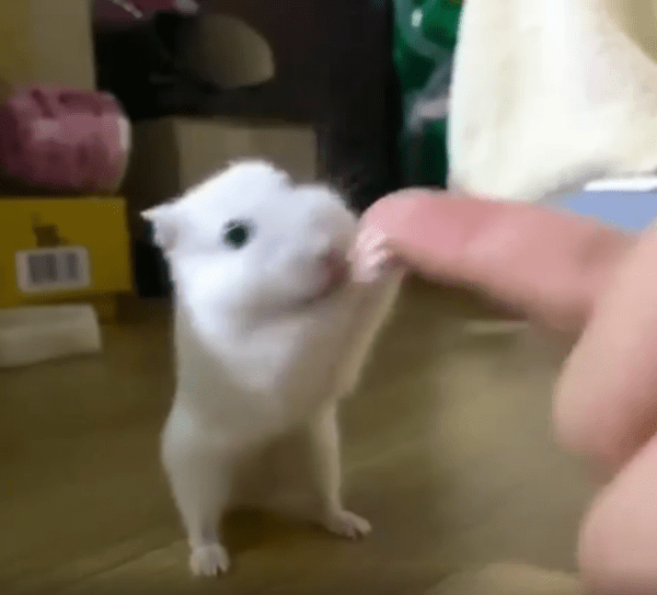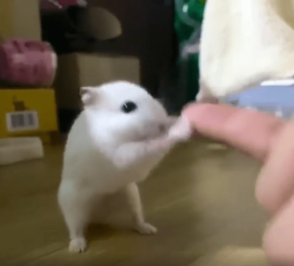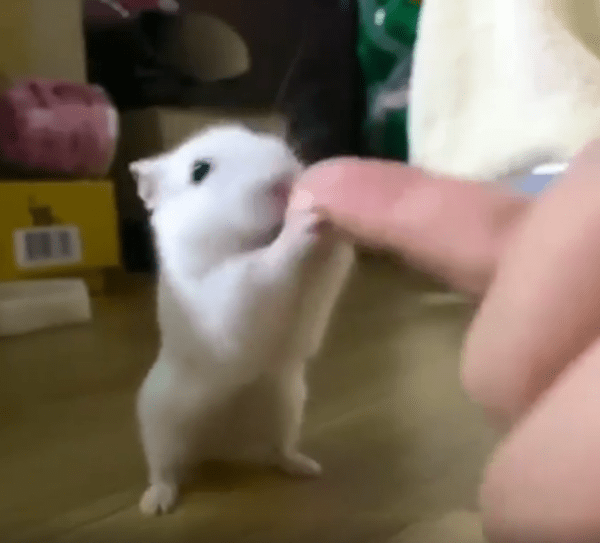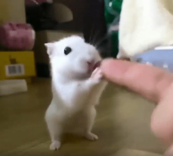 주인의 손가락을 꼭 잡은 채 양발로 일어서서 함께 흔들리는 하얀 햄스터, 작은 몸 안에 담긴 큰 교감