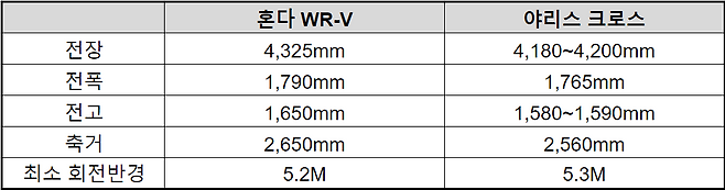 디자인은 2대 모두 비슷한 요소가 많다. 차체 제원을 살펴보면 WR-V가 모든 면에서 20~120mm 정도 더 크다. 차체가 약간 큰 편임에도 불구하고 최소 회전반경은 WR-V 쪽이 더 작아 운전이 쉬운 편이다. 선회 시 야리스 크로스보다 운전이 편할 것으로 예상된다.