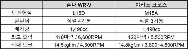 엔진 사양을 살펴보면 야리스 크로스가 약 2마력 정도 출력이 높다. 출력 수치상으로 보여지는 차이는 미미하지만 야리스 크로스쪽이 WR-V에 비해 상대적으로 저회전에서 출력이 나오는 특성 덕분에 가속 상황에서 유의미한 차이가 있다. 아울러 야리스 크로스는 공차 중량이 WR-V에 비해 가벼워 경쾌한 주행 감각을 자랑한다.