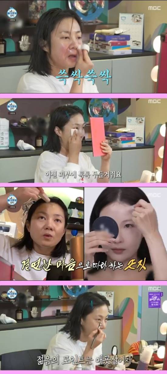 박나래는 갸름한 얼굴을 위해 괄사기구부터 활용했다. 이어 스킨, 로션, 항산화 세럼, 수분크림, 보습크림 등 기초 화장품 작업을 했다.