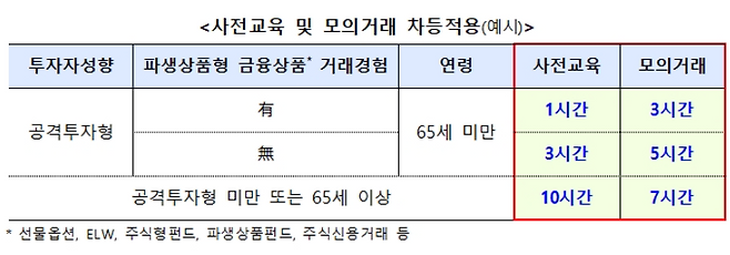투자자 보호 방안 적용대상은 시행일 이후의 신규 일반개인투자자다. 한편, 증권·선물사는 투자자의 투자성향이나 투자경험 등을 고려해 사전교육과 모의거래 시간을 자율적으로 차등적용할 예정이며 금감원 측은 사전교육이나 모의거래 의무화에 필요한 금융투자협회 규정과 시행세칙을 개정해 양질의 교육과 모의거래 과정을 마련하겠다고 밝혔다.