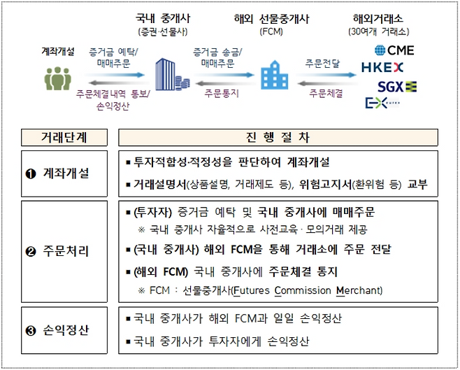 현재 해외 파생상품에 투자하려는 투자자들은 국내 중개사에 본인 명의의 게좌만 개설하면 증거금 예탁 및 환전 후 매매 주문이 가능한 것으로 알려져 있다. 하지만 신규 투자자들은 오는 12월부터 1시간 이상의 사전교육과 함께 3시간 이상의 모의거래 과정을 밟아야 한다.