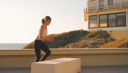 스텝박스나 안정적인 도구 앞에 서서 준비합니다. 왼발을 스텝박스 위에 올려놓고, 체중을 왼발로 지탱하며 오른발도 스텝박스 위로 올립니다. 두 발이 스텝박스 위에 완전히 올라선 자세를 유지합니다. 왼발을 먼저 내려놓고 이어서 오른발을 내려 돌아옵니다.