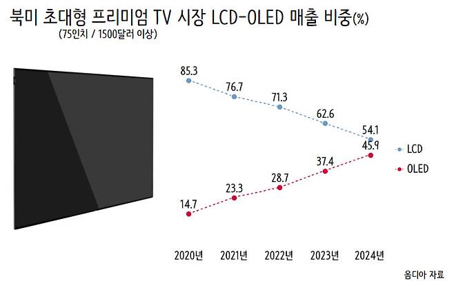 북미 초대형 프리미엄 TV 시장에서 OLED TV 매출 비중은 올해 약 46%에 달할 것으로 예상된다. 지난 2020년 14.7%에 그쳤던 비중이 불과 4년 만에 30% 포인트 넘게 증가해 50% 돌파를 눈 앞에 두고 있다.