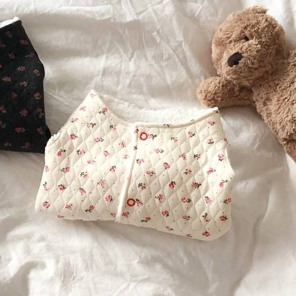 누빔에 털 안감까지 있어 따뜻한 강아지 조끼입니다. 쌀쌀한 가을, 겨울철 입히기 좋은 제품이에요. 잔꽃무늬 패턴의 빈티지한 디자인으로 귀엽답니다. 배 부분이 통이 조금 크게 나온 편이라고 하니 참고해 주세요.