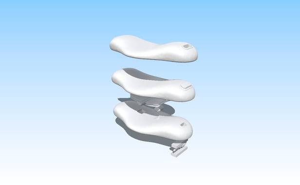 다양한 베개를 참고해 구체적인 형태를 잡았다. 허리와 목이 자연스레 안착되도록 가운데가 살짝 들어간 형태로 설계했다. 베개 모양이라 목(경추)에도 사용 가능하다. “편안한 사용감에 중점 뒀습니다. 공기압 장치의 이물감이 느껴지지 않게 메모리폼 소재를 사용했어요. 공기압 모드를 작동하지 않을 때도 그냥 베개 같은 푹신한 느낌입니다. 마사지감을 극대화하기 위해 온열 기능까지 더했습니다.”