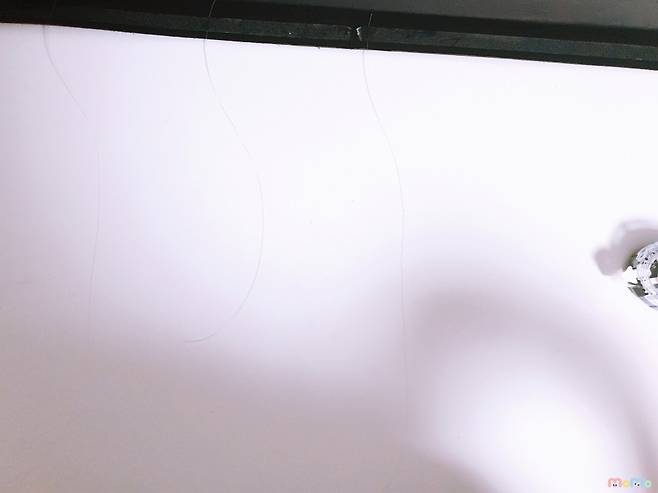 그리고 낚싯줄을 사진처럼 테이프 위에 붙여주세요. 저는 늘어나지 않은 제일 가는 낚싯줄을 사용했어요. 그리고 종이를 다시 접어 꾹꾹 눌러주시면 된답니다.
