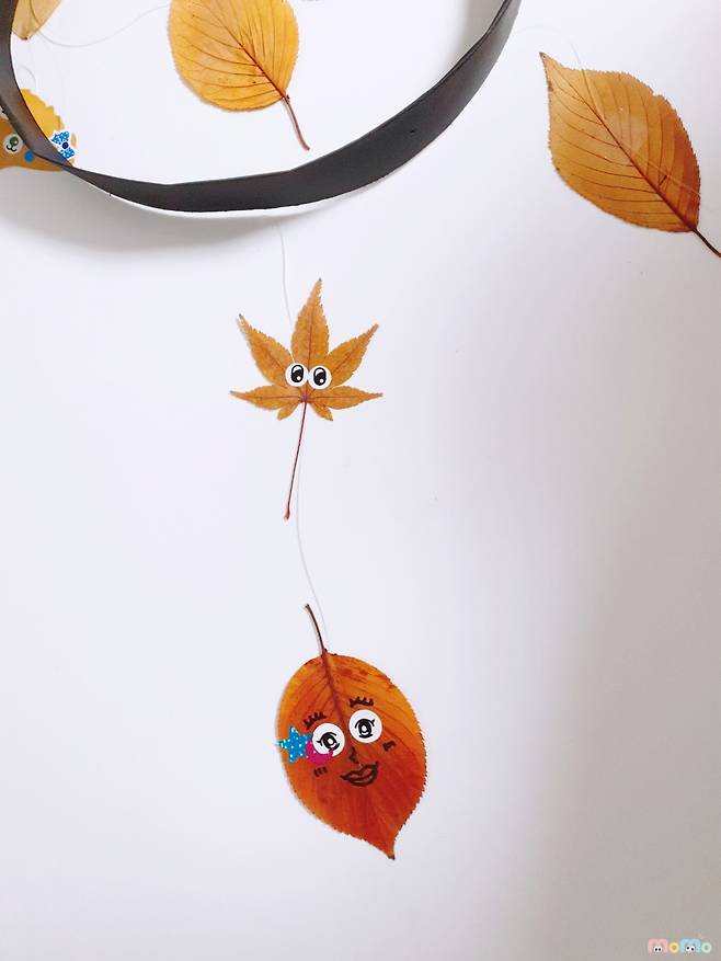 낚싯줄에 눈, 코, 입을 그리거나 붙여 만든 꾸민 낙엽과 단풍을 붙여주시면 된답니다. 저는 테이프를 이용해 붙여주었어요.