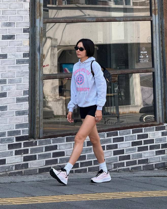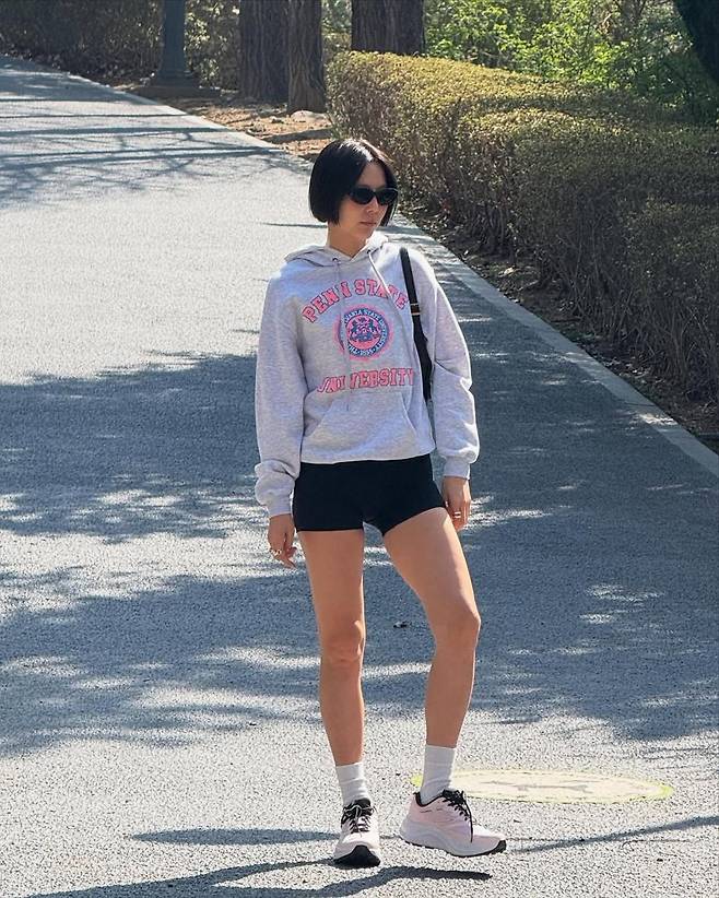 김나영은 이번 인스타그램 게시물에서 회색 후디와 블랙 쇼츠를 매치한 심플한 산책룩을 선보였다. 후디에는 ‘PENN STATE UNIVERSITY’ 레터링이 강조되어 미국식 캠퍼스 무드가 물씬 풍겼으며, 허벅지 중간까지 올라오는 타이트한 쇼츠로 그녀만의 당당한 실루엣을 드러냈다.