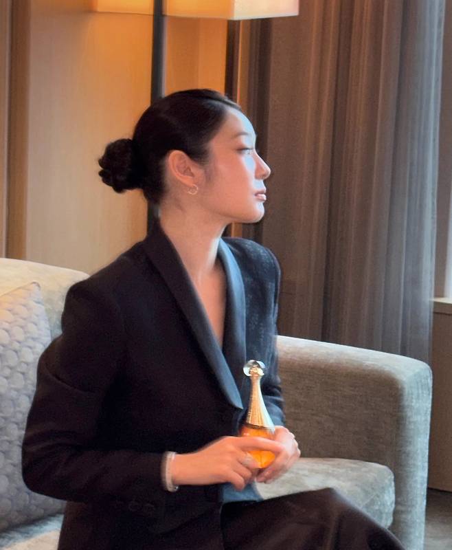 자켓의 매끄러운 질감과 단정한 칼라 라인은 김연아 특유의 지적인 이미지를 잘 살려주며 전체적인 분위기를 한층 기품 있게 만들어주네요.