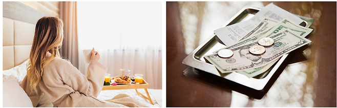 객실에서 룸서비스를 이용할 때 역시 레스토랑에서 음식을 주문할 때와 비슷한 수준으로 팁을 책정하는 게 좋습니다. 하지만 룸서비스와 호텔 레스토랑에서 식사를 할 때와의 가장 큰 차이는 일부 호텔의 경우에는 음식값에 팁 그리고 추가적으로 배달 팁까지 포함하는 경우가 있다는 점입니다.