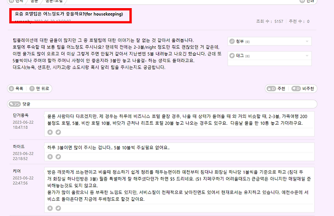 이밖에도 객실 내 필요한 물건을 추가적으로 요청을 할 때에도 2~5달러 정도의 팁을 챙겨주는 게 좋죠. 물론 각 나라별 팁 수준은 조금씩 차이가 날 수 있습니다. 그렇기 때문에 어느 정도 그 나라의 팁 문화를 미리 알아보고 여행을 가는 게 좋죠. 국내에 없는 문화로 인해 해외여행 시 다소 불편하거나 왜 팁을 줘야 하는지 이해를 못하는 분들도 분명 있을 겁니다. 하지만 팁은 분명 각 나라별 문화이기 때문에 어느 정도는 그 문화에 맞춰 여행을 하는 것 역시 하나의 여행의 묘미가 될 수도 있을 겁니다.