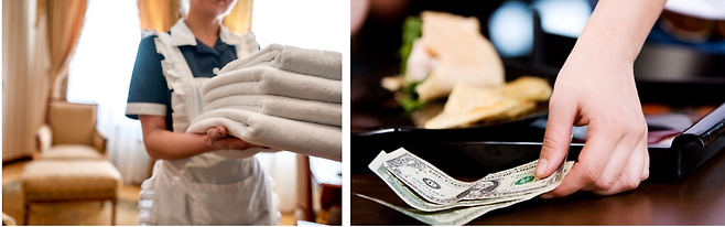 하지만 호텔 벨보이와 다르게 호텔 로비에 들어갈 때 문을 도어맨의 경우에는 굳이 별도의 팁을 줄 필요는 없습니다. 하지만 택시를 잡아주거나 짐을 함께 차량까지 옮겨주는 경우에는 별도로 1~2달러 정도의 팁을 챙겨주는 게 매너라고 하죠. 또 한 객실에 오래 머물 경우 객실 청소를 하는 직원에게는 굳이 팁을 별도로 챙겨줄 필요는 없지만 조금 더 신경을 써 달라는 의미로 침대에 1달러 혹은 5달러 정도의 팁을 챙겨주는 게 좋다고 합니다.