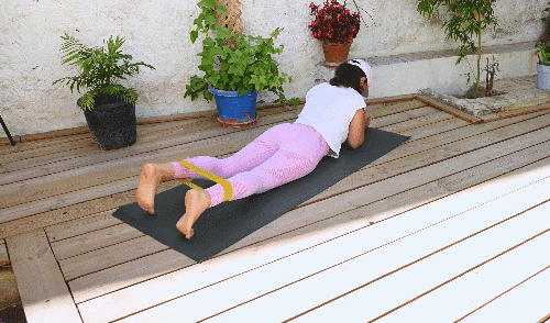 배를 대고 엎드립니다. 팔꿈치를 굽혀 팔뚝으로 상체를 들어 지탱합니다. 다리 사이에 저항 밴드를 착용합니다. 왼쪽 무릎을 굽히며 발을 엉덩이 쪽으로 당겨 햄스트링을 수축합니다. 다리를 펴 원래 자세로 돌아옵니다. 오른쪽 다리도 반복합니다.