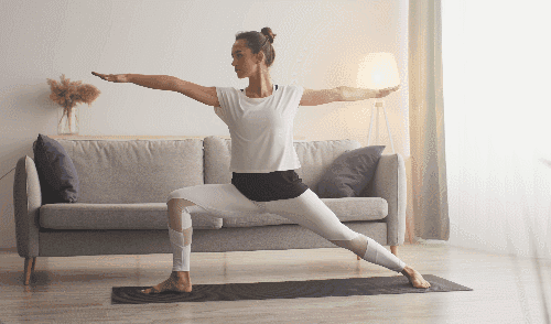 매트에 똑바로 서서 시작합니다. 오른쪽 다리를 앞으로 뻗고, 무릎을 90도로 구부립니다. 왼쪽 다리는 뒤로 곧게 뻗어 바닥에 붙입니다. 상체는 정면을 향하고, 팔을 양옆으로 수평으로 벌려 양손 끝이 같은 높이와 일직선이 되도록 맞춥니다.