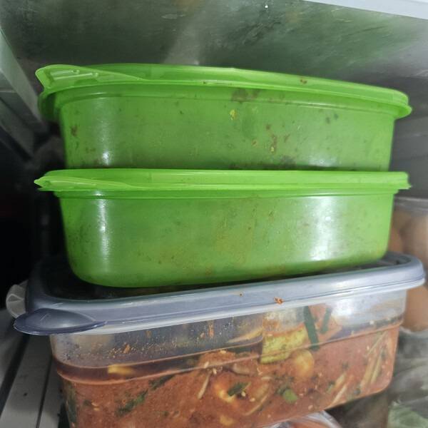 김치국물에 착색된 반찬통, 이미 오래 쓴 흔적이 보이는 뚜껑과 용기. 이런 통을 그냥 세척해서 다시 쓰는 경우가 많습니다.