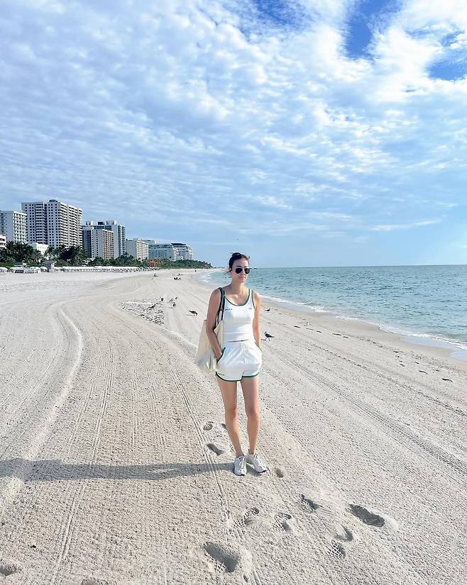 이 외에도 해변에서는 화이트 탱크톱과 쇼츠로, 시내에서는 오버핏 티셔츠 원피스로 TPO에 맞는 세련된 스타일을 자랑했습니다.