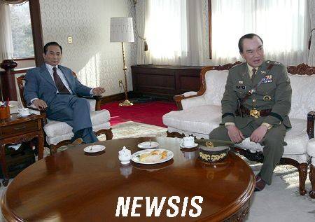 【청원=뉴시스】 MBC 드라마 제5공화국에서 전두환 역으로 출연한 이덕화(오른쪽 군복)가 6일 충북 청원군 문의면 청남대 촬영장에서 가발을 벗고 열연하고 있다.
