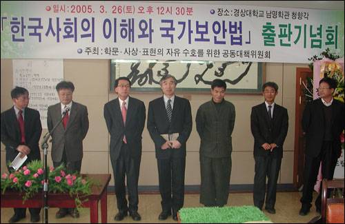 [오마이뉴스 윤성효 기자] ▲ 경상대 교양교재 <한국사회의 이해> 집필 교수들이 책 출판기념회에 참석해 인사를 하고 있다. ⓒ2005 와이뉴스 윤성효 국가정보원 진실위원회(위원장 오충일)가 11년전 국가보안법 위반 혐의로 기소되어 최근 대법원으로부터 무죄 선고를 받은 경상대 교양교재 <한국사회의 이해>사건과 관련한 진상조사를 벌일 것으로 보인다.