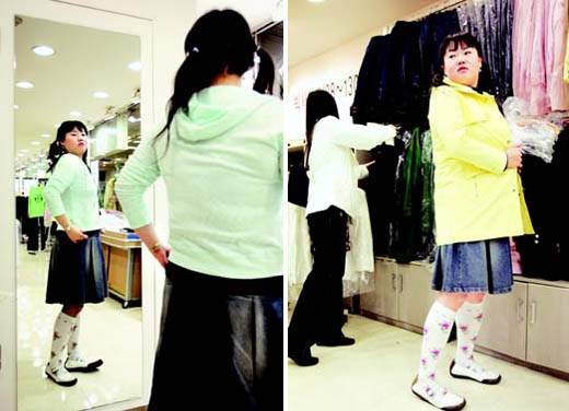 취향에 맞는 봄옷을 구입하기 위해 처음 들른 곳은 서울 중구 롯데백화점. 2층여성캐주얼 매장에 들어서자 오드리 햅번을 연상시키는 공주풍 의상이 가득한ㅅ매장이 눈길을 잡아끈다. 하지만 “사이즈 있나요…”라는 이씨의 말끝에물음표가 붙기도 전에 돌아온 매장 직원의 대답, “66까지 밖에 안 나오는데요.”“가슴둘레・엉덩이둘레・신장이 89・95・165㎝ 이하인 66 사이즈 까지만 백화점옷을 입을 수 있다니…너무한 거 아녜요?” ‘혹시나’했다가 ‘역시나’하고 백화점을 나선 이씨는 동대문운동장역지하상가에 위치한 단골 빅사이즈 전문매장 ‘아이올라’로 향했다. 옷 가게에들어서자, 진한 초록색 트렌치 코트와 연분홍 스트링 후드 롱자켓, 진분홍 꽃무늬플리츠 스커트와 곤색 끈 민소매 티셔츠까지 일반 옷들과 엇비슷하게 화사한빅사이즈 의상들이 천지. 이 매장에는 상의 77・하의 88을 ‘스몰 사이즈’로하고, 130 사이즈까지 ‘기성복’이 구비돼 있었다. 이씨는 “큰옷이 많으니,골라입는 재미가 있다”며 백화점에서 시무룩해진 마음을 활짝 폈지만, 좀 더화려한 옷을 찾기 위해 근처 두산타워로 향했다.