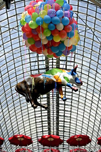 ◇요즘 러시아 수도 모스크바 시내 곳곳에는 형형각색의 소들이 넘쳐난다. '카우 퍼레이드'(CowParade) 때문이다. 전 세계 예술가들은 유리섬유로 만든 실물 크기의 소 형상에 화려한 색깔을 입힌 작품을 만들어 공공장소에 설치해놓는다. 예술가들은 행사 막바지에 이 작품을 경매에 부쳐 얻은 수익금으로 불우 어린이들을 돕는다. 1998년 스위스 취리히에서 관광객을 끌어모을 요량으로 시작한 이 행사는 이후 뉴욕과 런던, 프라하, 상파울루 등 세계 대도시를 돌며 '국제 문화 프로젝트'로 발전했다. 사진은 모스크바 붉은광장 인근의 GUM 백화점 유리천장에 매달린 작품이다. 모스크바=�케찻�