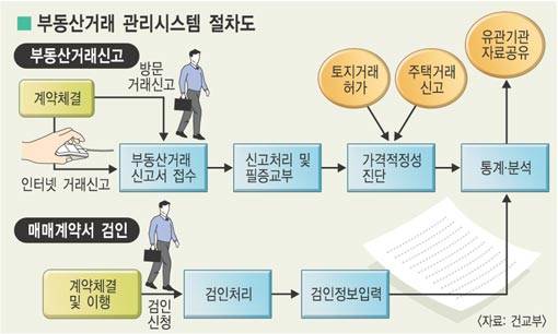 지난해 10월 개발에 착수해 올 6월 완료된 부동산거래 관리시스템은 현재 서울 강남구와 경기도 안양,수원,용인 등 4곳에서 시범운영중인데 '전자신고시스템' '거래가격 적정성 진단시스템' '유관기관 정보공유시스템' '통계 및 분석 시스템' 등 4가지로 구성돼 있다.