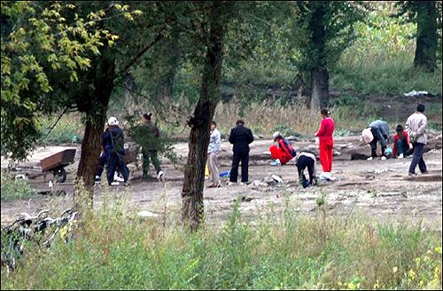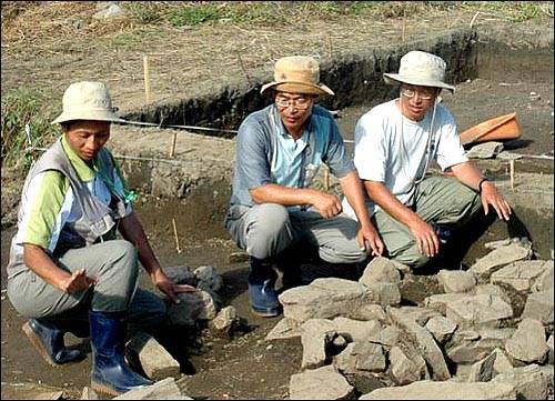 | ▲ 크라스키노 발해성에서 발굴 작업중인 고구려연구재단 발해팀 연구원들. 왼쪽부터 김은국 박사, 임상선 박사, 정재운 박사. |