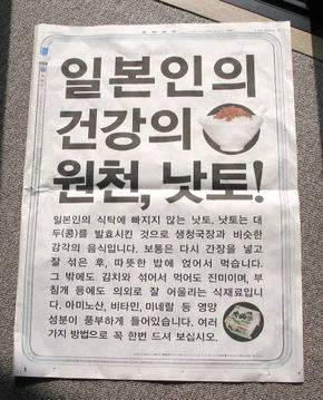 신문은 이날치 4면에 '일본인의 건강의 원천, 낫토'라는 제목으로, 콩을 발효시킨 일본의 전통식품인 낫토를 선전하는 한글 전면광고를 실었다. 광고는 "일본인의 식탁에서 빠지지 않는 낫토는 생청국장과 비슷한 감각의 음식으로, 김치와 섞어서 먹어도 진미이며, 부침개 등에도 의외로 잘 어울리는 식재료"라며 여러 방법으로 꼭 한번 먹어보라는 내용을 담고 있다.