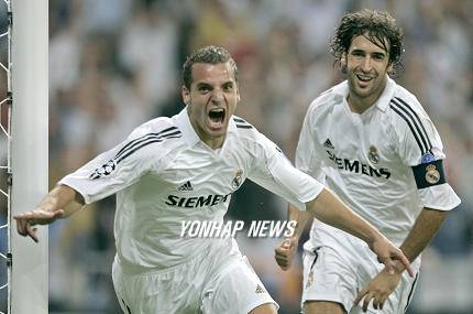 Real Madrid's Roberto Soldado, left, celebrates with his team captain Raul Gonzales after Soldado scored the winning goal against Olympiakos during a Group F UEFA Champions league soccer match at the Bernabeu stadium in Madrid Wednesday Sept. 28, 2005. Real Madrid won the match 2-1. (AP Photo/Paul White)