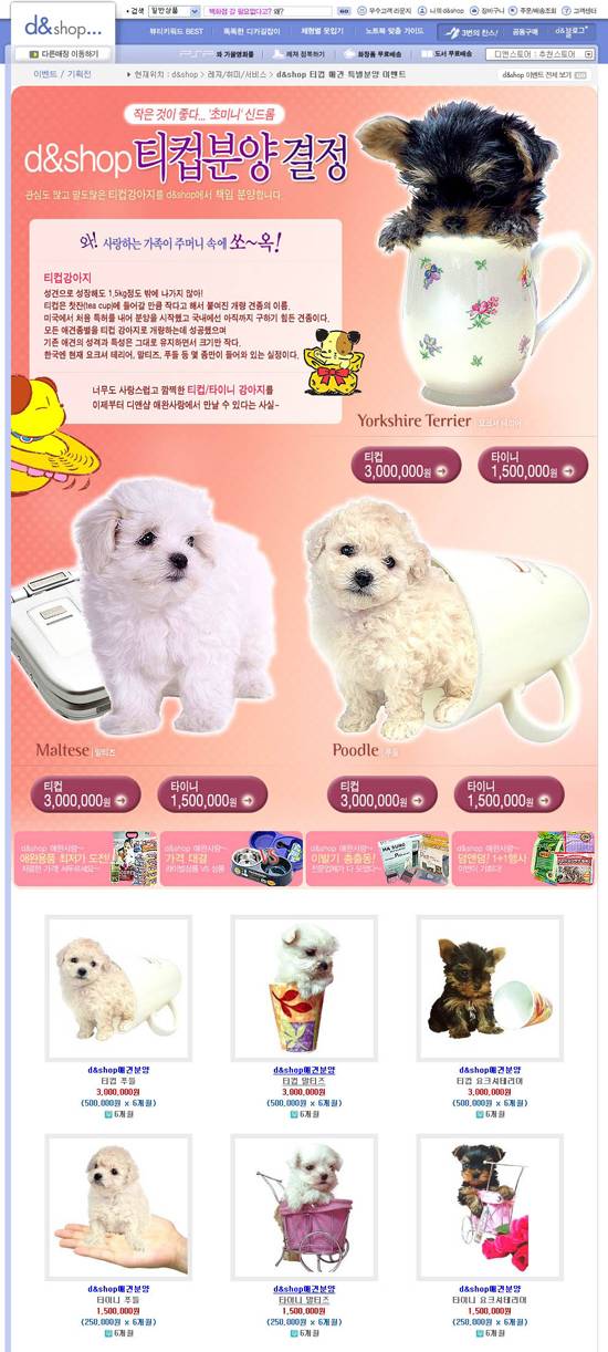 온라인 종합쇼핑몰 디앤샵(www.dnshop.com)은 업계 처음으로 요크셔테리어, 말티즈, 푸들 종의 '티컵' 강아지(초소형강아지)를 판매한다.