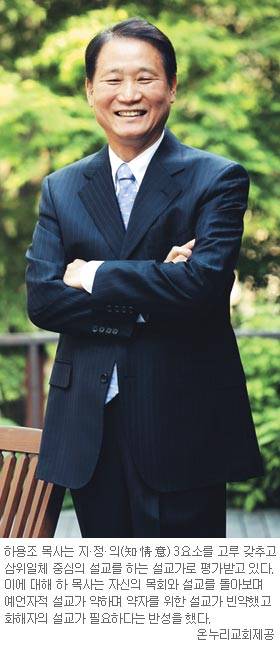 △하용조 목사의 설교세계(유상현 연세대 교수)=하 목사는 목회 형식의 창조적 변화를 통해 한국 교회와 설교자들에게 새로운 예배와 설교 모형에 관한 상상력의 출구를 열게 했다는 인식을 줬다. 급변하는 동 시대인의 감각과 수요에 부응하는 예배 형식을 개발하고 교회내의 문화적 계층적 세대적 다양성에 섬세하게 반향하는 그의 설교는 근본적으로 젊고 역동적이어서 미래지향적이다. 또 한국 교회 강단의 감수성을 선도한다. 우리 시대의 기독교와 세속문화의 접점에 서서 복음의 개척 지경을 넓히는 전위 역할을 한다.