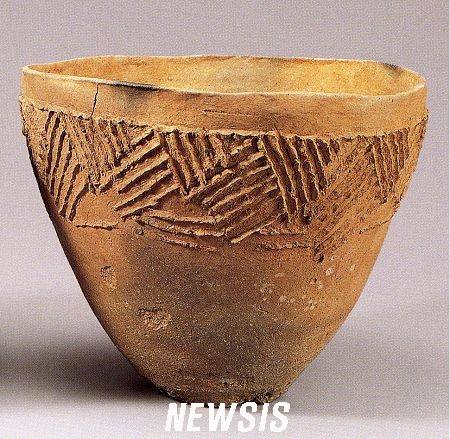 이는 당시 신석기인들이 토기에 무늬를 넣기 전에, 미리 전체 토기둘레를 가늠한 뒤 일정한 크기로 나누어 무늬를 붙인 것으로, 신석기인들의 뛰어난 공간구성 능력과 미적 감각을 느낄 수 있다. 강원도 고성 문암리 유적에서 출토되었다. /국립중앙박물관 제공 http://www.museum.go.kr