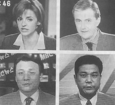 시선에 따른 민족성, 스페인(위좌측) 프랑스(위우측) 한국(하좌측) 사람들은 왼쪽으로 보면서 말한다. 남방계인 일본인(하우측) 아나운서는 오른쪽에 시선을 둔다(자료 조용진). |