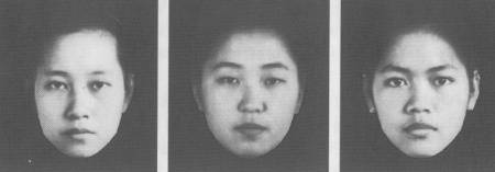 민족 간 평균 얼굴, 눈이 특이하게 작고 얼굴이 오목한 것은 한국인 고유의 특징이다. 왼쪽부터 중국인, 한국인, 태국인이다(자료 조용진). |