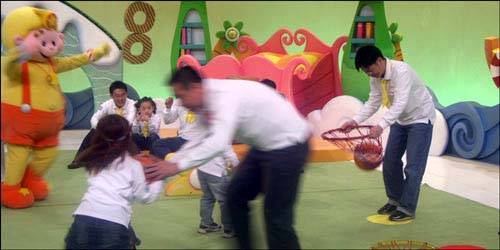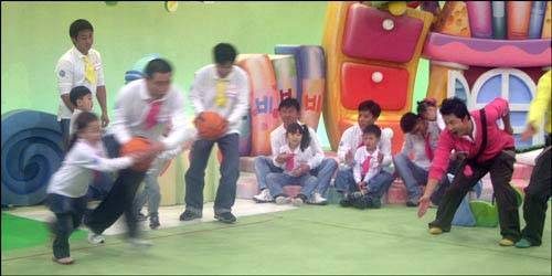 이날 놀이는 농구공을 가지고 튀기기, 주고 받기, 점프, 골 넣기, 팀 대결 등으로 진행됐는데, 아빠의 땀을 요구한 것은 본 놀이보다 몸 풀기였습니다. <부빠> 주제가에 맞춰 아이들과 온몸을 비비고 트위스트를 추는 아빠들의 모습, 그러나 연출진에서는 좀 더 예쁘고 표정이 다양한 화면을 원합니다. 그래서 보통 두세 번은 같은 장면을 찍었습니다.