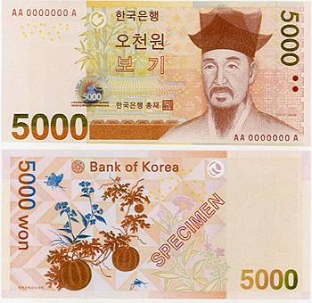 20일 한국은행과 인터넷 경매사이트 옥션(www.auction.co.kr)에 따르면 지난 19일 오후 새 5000원권 경매가 시작된지 하루도 채 지나지 않아 7777번째로 인쇄된 화폐 일련번호 'AA0007777A'의 지폐가 포함된 새 5000원권 10장은 액면가의 100배인 500만원까지 치솟았다.