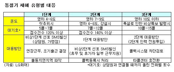 LG화재는 3단계로 구분된 '재해 유형별 대응방안'에 따라 동절기 재해 대응에 대처하고 있다.