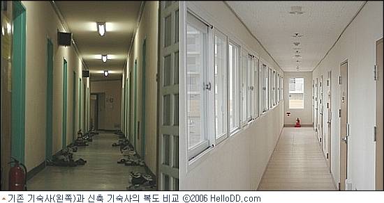 아래 사진의 좌측이 기존의 기숙사 복도고 오른쪽이 새로 신축한 기숙사의 복도다.