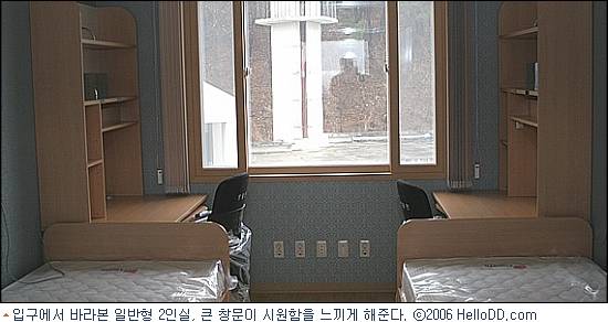 일반형 2인실, 원룸형 2인실, 원룸형 1인실이 준비돼 있는 이 기숙사의 모든 출입문은 학생들의 카드키를 이용해 열도록 설계돼 있다. 카드키를 인식 시키고 들어가면 커다란 창문이 정면에 보이는 환한 방을 마주치게 된다.
