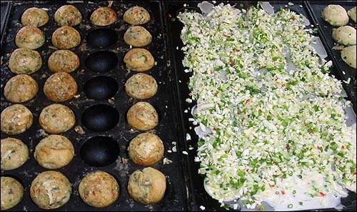 그중 유독 기자의 눈길을 사로잡은 것은 속칭 '문어풀빵'으로 불리는 다코야끼를 파는 노점. 문어 등 여러 가지 재료가 들어간 묽은 밀가루반죽을 파와 양파, 양배추 등의 야채와 함께 둥글고 오목한 철판 위에서 구워내 가쓰오부시(가다랭이 가루)를 올려먹는 다코야끼는 "길거리음식 중엔 비교적 신메뉴"라는 게 30대 중반 주인의 설명이다. 가격은 8개 3천원. 이 정도 양이면 남자도 배가 든든해진다.