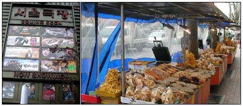 서울극장 앞에만도 오징어와 쥐포, 고구마튀김과 군밤 등 영화보며 먹기 좋은 간식을 파는 노점이 10여 개에 이른다. 초등학교 시절을 떠올리게 하는 번데기와 뻥튀기를 파는 곳도 있어 옛날 추억을 부른다. 하지만 극장이 외부에서 사온 음식물의 장내 반입을 허락치 않아 장사가 예전만 못하다고 한다.