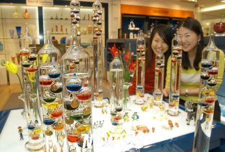 21일 오전 서울 소공동 롯데백화점에서 '갈릴레이 온도계'라는 이름의 이색 온도계를 선보이고 있다.
