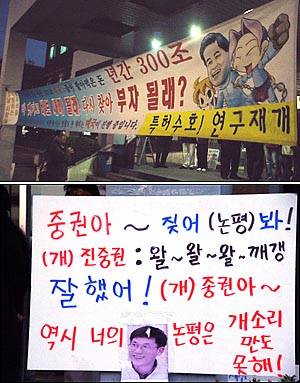 | ▲ 진중권씨 강연이 시작되기 전 황우석 박사 지지자들이 건물 현관에 펼침막과 피켓을 걸어놓아 학생회 측과 마찰을 빚기도 했다. | |