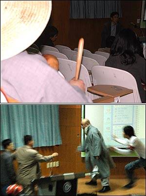 강의 방해가 5분 가량 계속 되더니 그만 목탁이 깨지고 말았다. 승려는 목탁을 강의실 바닥에 내쳤다. 그래도 분이 풀리지 않았는지 이내 단상으로 올라갔다. 강단 왼쪽 아래서 단상을 놓고 강연을 하던 진씨가 순간 뒤로 물러섰다. 수강생 일부가 앞으로 나와 승려를 말렸다.