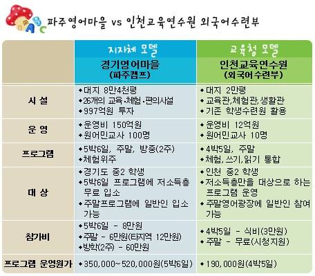 지자체 모델인 파주 영어마을과 교육청 모델인 인천교육연수원 외국어수련부의 5박6일 프로그램을 비교해보자. 파주영어마을의 5박6일 프로그램은 중학교 2학년 학생을 대상으로 하는 프로그램으로 학교별로 500명이 매주 월요일 입소하여 드라마·음악·과학·오락 등 전공을 선택하여 실생활과 연결된 학습을 한다. 전공별로 프로젝트를 진행하여 최종 결과물을 얻는 체험위주의 실습프로그램으로 드라마나 뮤직비디오 제작, 쿠키·로봇 만들기, 병원·은행 등에서의 각종 상황극으로 수업이 진행된다.