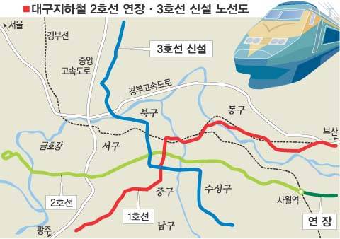 28일 대구지하철건설본부에 따르면 북구 칠곡동에서 수성구 범물동을 잇는 23.95㎞구간의 지하철 3호선 건설공사(1조2191억원)는 2019년까지, 수성구 사월동∼경산시 영남대를 잇는 3.32㎞ 구간의 지하철 2호선 연장공사(2054억원)는 2012년까지 각각 완공할 계획이다.