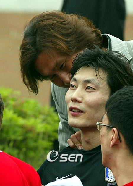 19일 파주 NFC에서 2006 독일 월드컵을 향한 태극전사들의 강도 높은 훈련이 이어졌다. 파주 NFC를 찾은 유상철 KBS 해설위원이 훈련 후 송종국을 만나 반갑게 이야기하고 있다./파주=박영태 기자 ds3fan@osen.co.kr