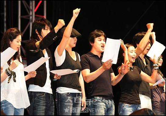 박중훈 김혜수 전도연 김수로 문소리 강혜정 이준기 등 영화배우 10여명은 1일 오후 9시께 서울 광화문 열린시민광장에서 열린 '참여정부엔 국민이 없다'라는 제목의 문화제에서 스크린쿼터 사수 및 한미 FTA 저지를 위한 선언문을 낭독했다.