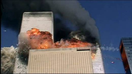 이 화면을 보면 WTC 북측 건물이 비행기 충돌로 붕괴되기 직전 오른쪽에서 무언가 굴러 떨어지며 폭발이 먼저 일어난 것을 알 수 있다. 완벽한 폭파 공법이라는 의혹을 사는 대목이다. 어쨌든 이들 건물은 세계 역사상 건물 화재로 주저앉은 유일한 건물들이다.